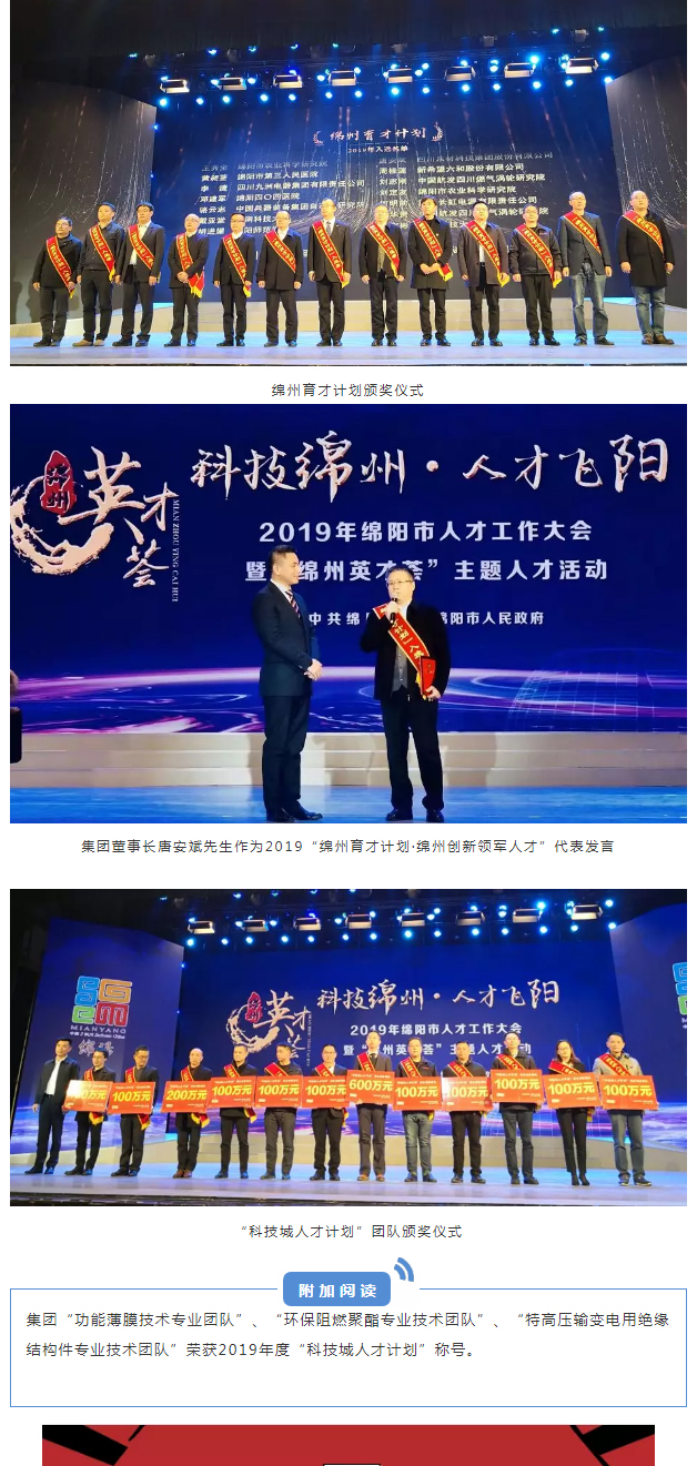 12月10日,綿陽市市委組織部等12部門聯(lián)合發(fā)布《關(guān)于印發(fā)2019年“綿州育才計劃”入選者名單的通知》(綿組通〔2019〕78號),公示了14類125名入選者名單,公司董事長唐安斌成功入選2019“綿州育才計劃·綿州創(chuàng)新領(lǐng)軍人才”, 總經(jīng)理曹學(xué)成功入選2019年“綿州育才計劃·綿州企業(yè)管理菁英”。