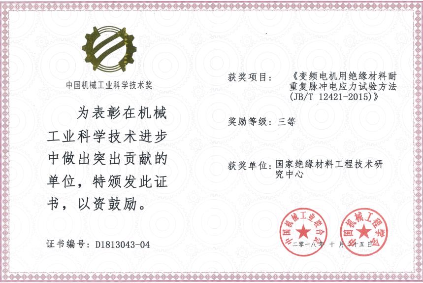 由中國機械工業(yè)聯(lián)合會和中國機械工程學會共同設(shè)立“中國機械工業(yè)科學技術(shù)獎”,是中國機械領(lǐng)域最具權(quán)威的獎項之一。近日,2018年度中國機械工業(yè)科學技術(shù)獎獲獎項目公布,我公司(國家絕緣材料工程技術(shù)研究中心)參與制定的行業(yè)標準JB/T12421-2015《變頻電機用絕緣材料耐重復(fù)脈沖電應(yīng)力試驗方法》榮獲 ...
